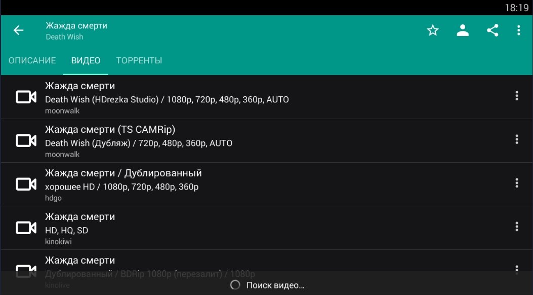 Поиск видеофайлов происходит на сайтах moonwalk.cc, tree.tv, zona.mobi, filmix.net, my-hit.org, tivio.net, kino-rex.com, kinokong.net. В настройках можно выбрать, по каким ресурсам производить поиск.