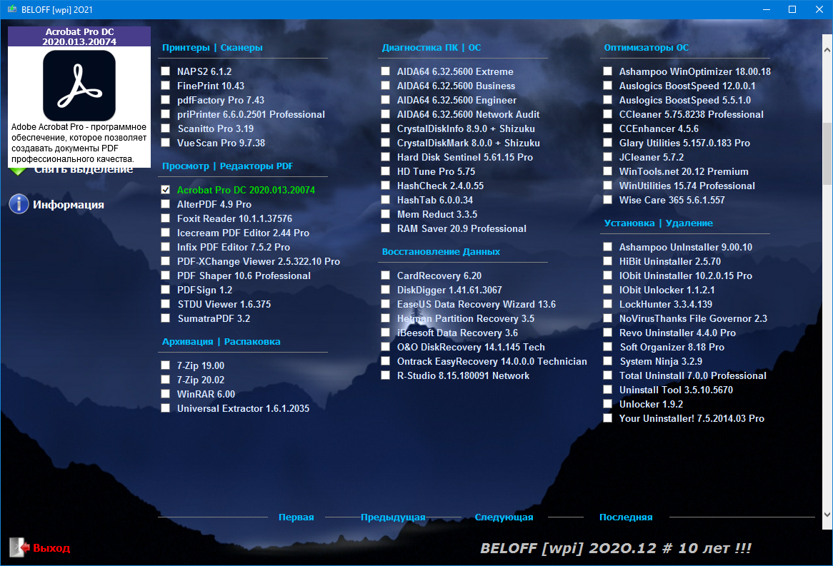 Универсальный Сборник Лучших Программ Рунета, распределённых по категориям, с Автоматической Установкой в Операционные Системы Windows. В Сборник дополнительно добавлены Портативные Программы, которые можно будет легко использовать как с Диска и Виртуального Привода, так и с USB-накопителей, включая установку MInstAll и WPI, а также автоматическую установку драйверов с помощью Snappy Driver Installer и DriverPack Solution. Для большего удобства использования Сборника добавлена Мультизагрузка.
