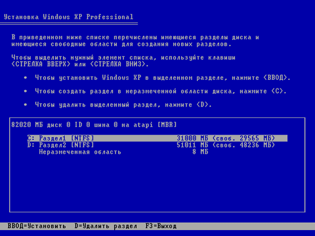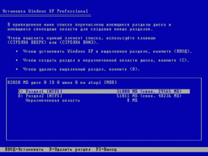 раздела для установки, и