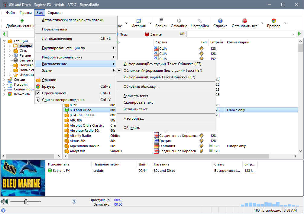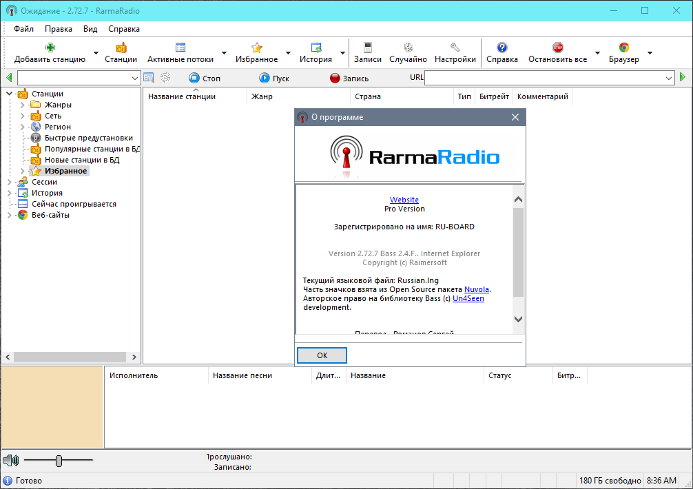 RarmaRadio - программа для прослушивания и записи интернет-радиостанций. Обладает большим набором возможностей, обеспечивая комфортное прослушивание радиостанций и удобную запись транслируемых данных. Программа содержит множество станций рассортированных на группы в зависимости от жанра музыки, битрейта, сети и региона, имеет функцию поиска станций, автоматически скачивает из Интернета информацию о проигрываемых песнях, включая альбомную графику, и поддерживает подключение плагинов медиаплеера Winamp. С помощью RarmaRadio можно слушая одну станцию, одновременно записывать несколько других интернет-радиостанций, осуществлять запись интернет-вещания по расписанию, а также автоматически начинать запись, в случае если заиграла определенная композиция. При сохранении полученных аудио файлов RarmaRadio добавляет в них теги.