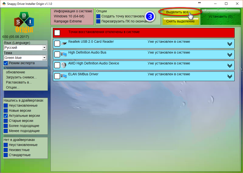 - Кнопка “Установить” запускает установку выбранных драйверов.