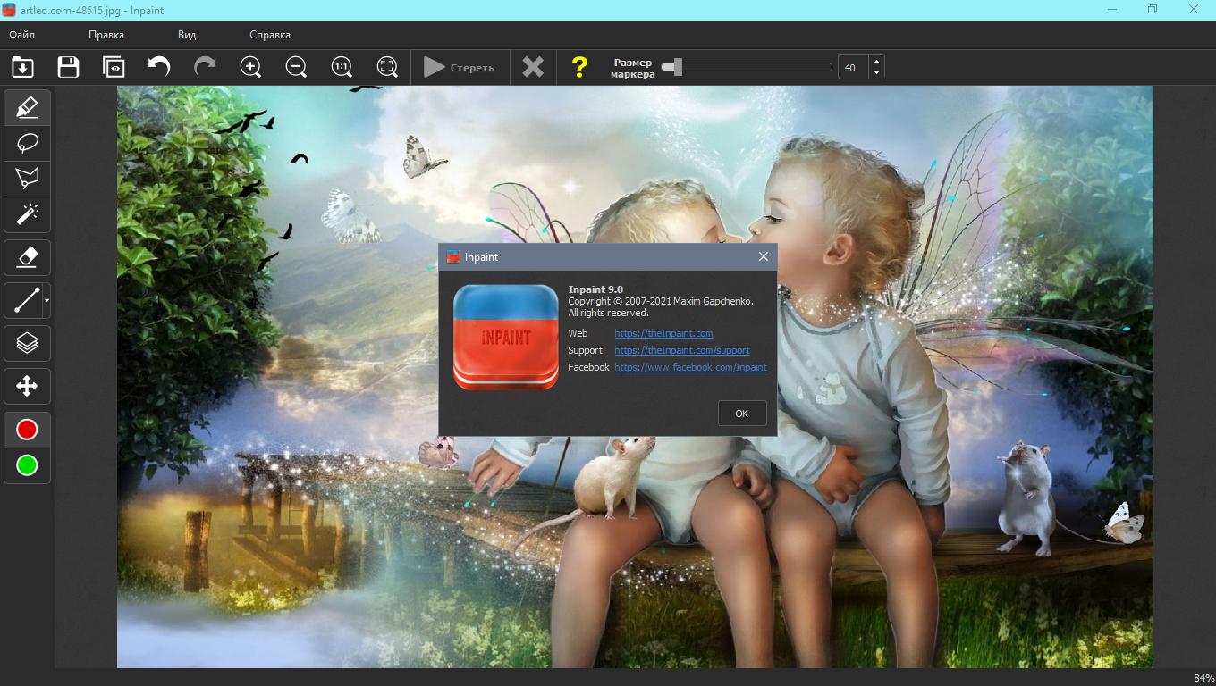 Inpaint - позволяет умно удалять нежелательные элементы на цифровой фотографии, такие как ненужные объекты, текст, случайно попавшие элементы, а также пыль, рекламу, мусор, царапины и грязь. Часто, скачивая из Интернет картинки, мы сталкиваемся с таким неприятным явлением, как наличие логотипов, водяных знаков и надписей. Что делать в таком случае? Не тратить же свое время на обработку, в общем то, не очень необходимой картинки. Тем более в таких тяжелых программах, как Photoshop. Но, все таки, хочется сохранить ее. В этом случае и поможет данная программа. Программа реконструирует фоновую поверхность. Вам необходимо только выделить объект и нажать всего лишь одну кнопку.