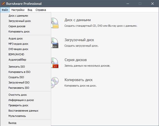 BurnAware - это простой и надежный инструмент для записи и копирования любых дисков. Программа позволяет выполнять различные задачи, связанные с записью и работой с дисками: копирование, создание аудио CD и DVD-Video, работа с Blu-Ray и клонирование дисков.
