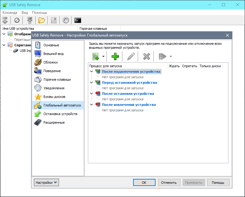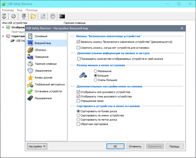 - Вы уникальны. Поэтому, USB Safely Remove позволяет изменить множество аспектов его поведения, чтобы Вы могли приспособить программу под свой вкус. Например, можно заставить программу скрывать иконку из системного трея, когда в меню нет ни одного устройства.