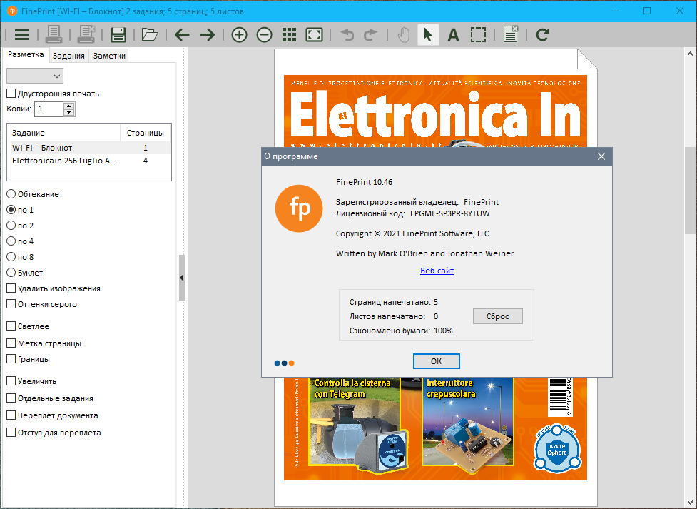 - Отображение количества сэкономленной при помощи FinePrint бумаги