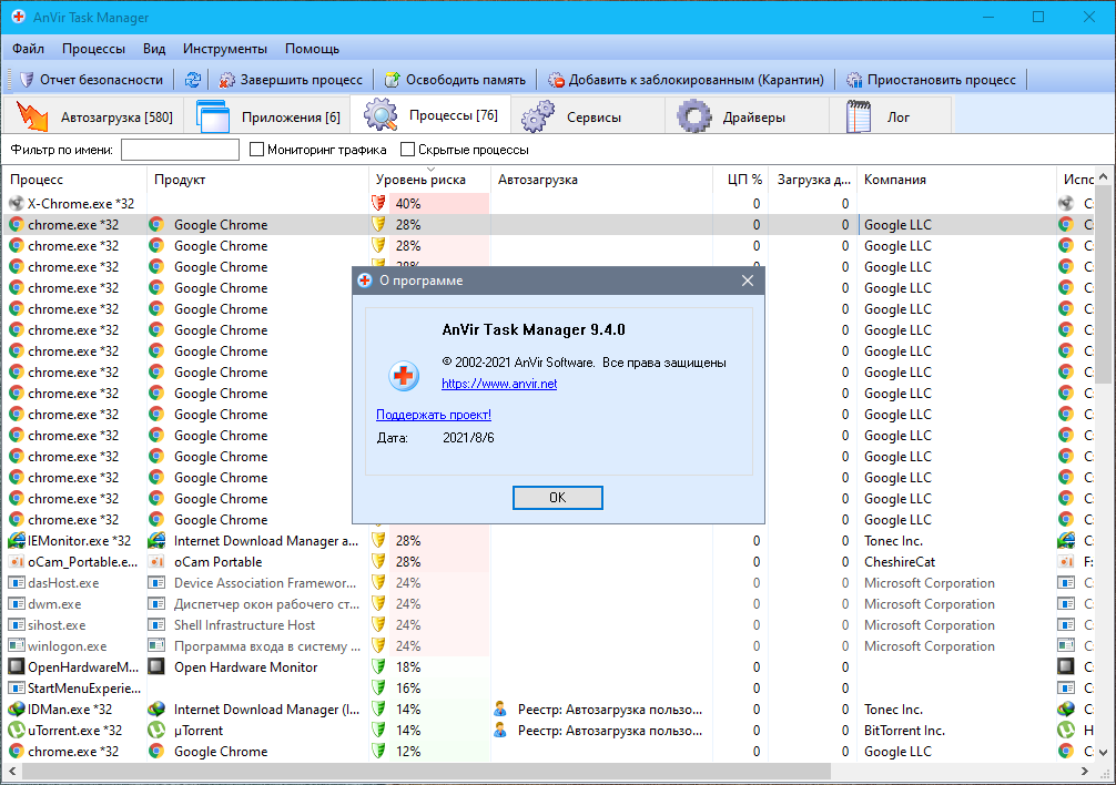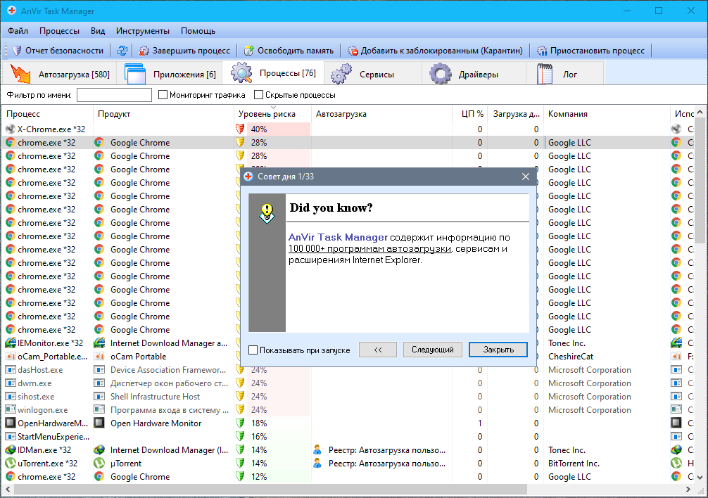 AnVir Task Manager предоставляет подробную информацию о работе системы и, в то же время, предоставляет большое количество инструментов для управления Windows. Для того, чтобы заменить все функции AnVir Task Manager, придется установить около 10 разных программ.