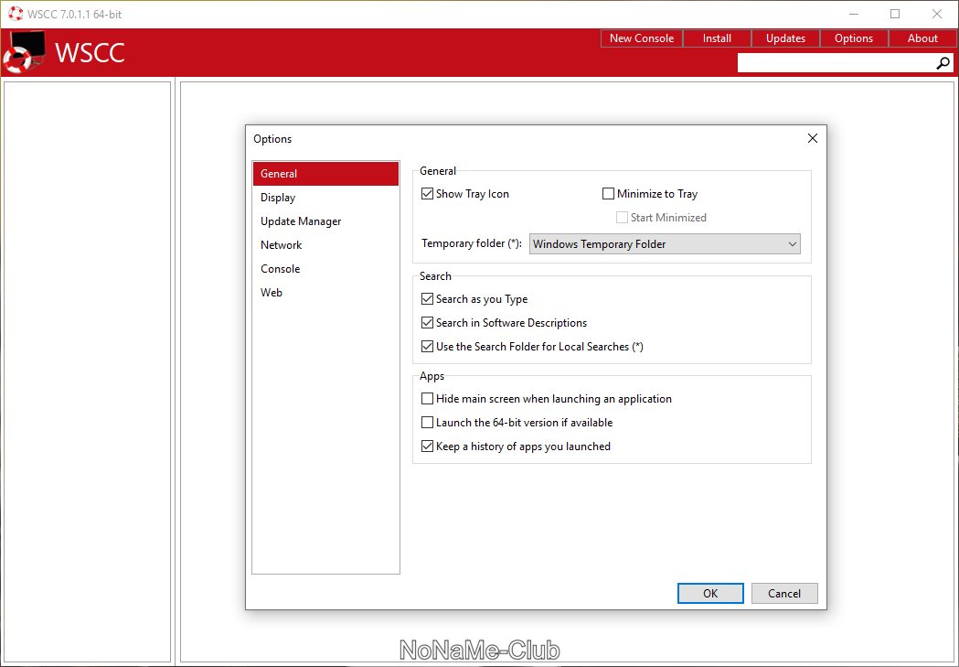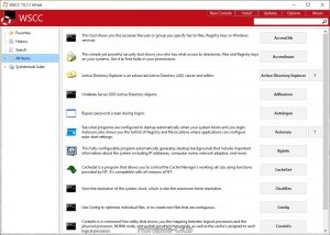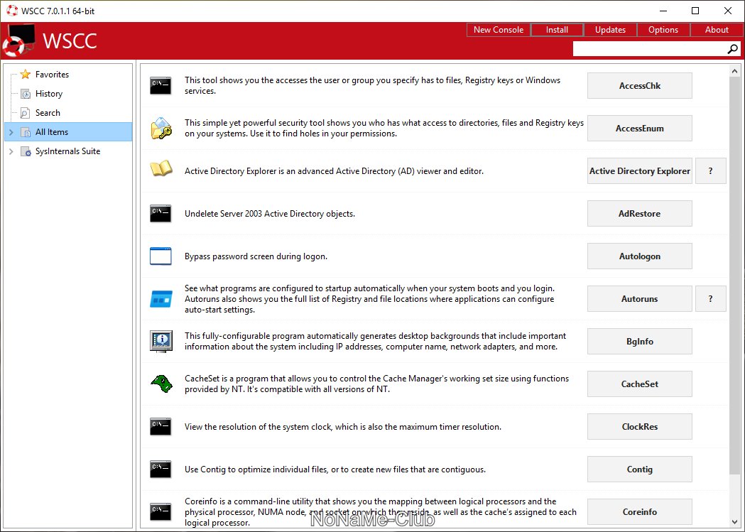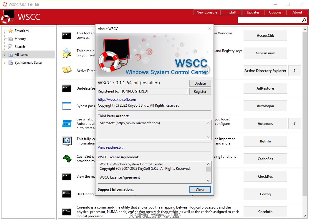 WSCC (Windows System Control Center) - портативная программа, представляющая из себя оболочку, которая объединяет в себе пакеты Sysinternals Suite и NirLauncher. Все утилиты входящие в данный набор, разделены по категориям в зависимости от назначения, а также присутствует возможность запуска некоторых встроенных средств Windows.