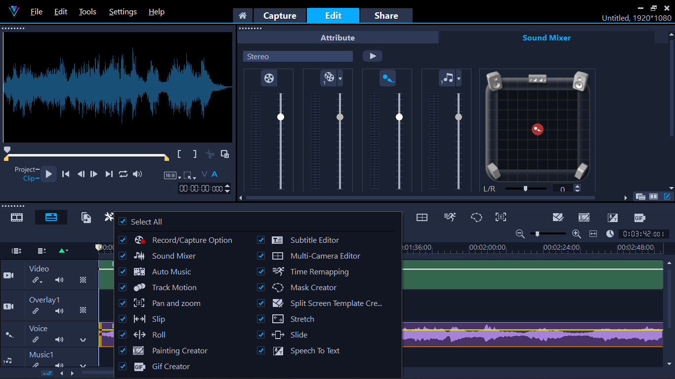 Модернизированный редактор в режиме волнового представления звука позволяет с легкостью выполнять тонкую аудионастройку и добиваться высококачественного звучания. Улучшенный интерфейс отличается повышенным удобством в области поиска и использования взаимосвязанных инструментов: теперь высокочастотные и низкочастотные волны хорошо различимы в окне предпросмотра, а все аудиоинструменты расположены на вкладке музыки (панель параметров). Все это обеспечивает интуитивно понятный и согласованный подход к управлению звуком в ваших видео.