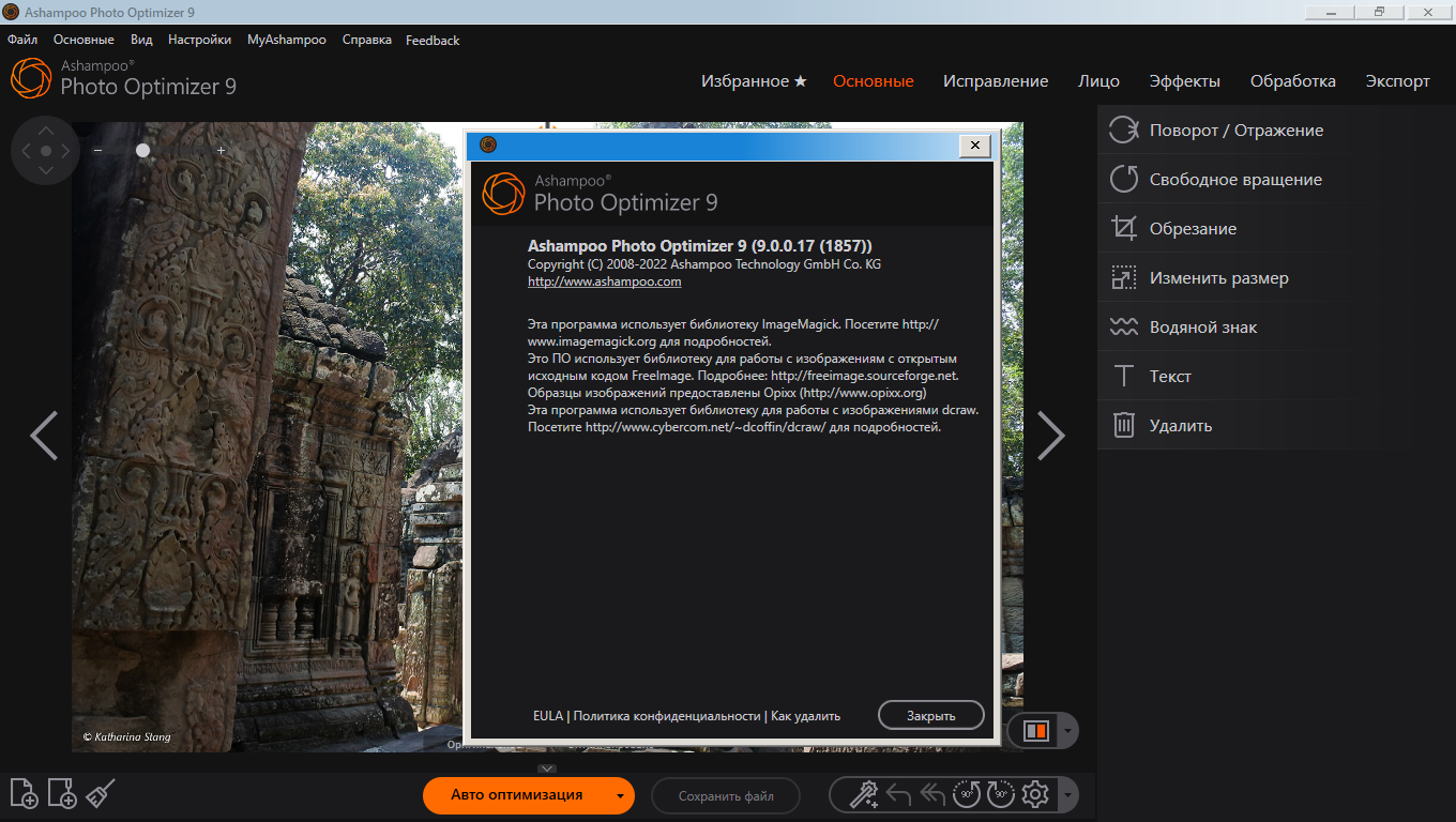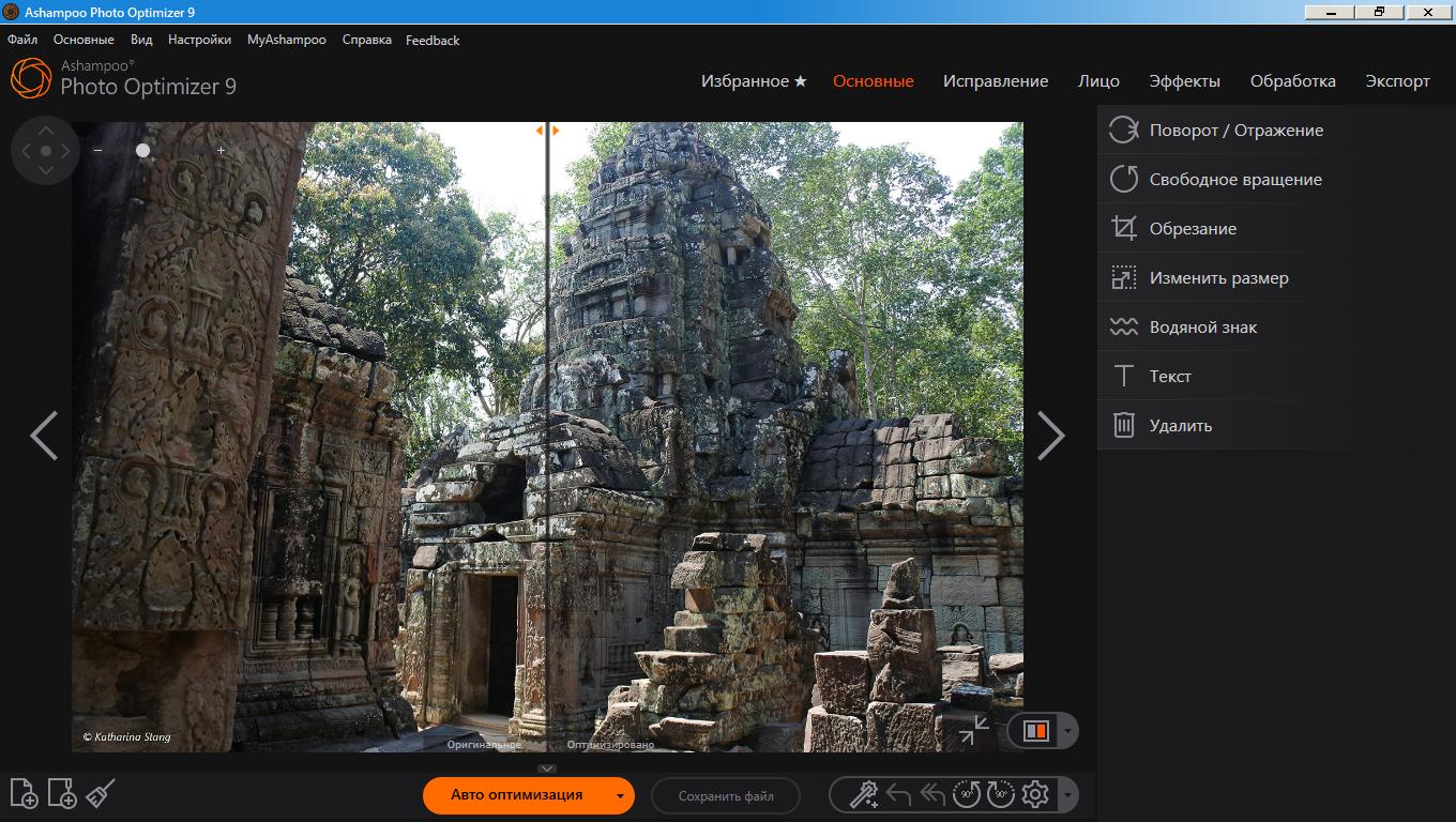 Естественно, Ashampoo Photo Optimizer 9 обладает всеми обычными функциями, такими как обрезка, вращение, добавление водяного знака и сглаживание. Но это ещё не всё. Не стесняйтесь проявлять творческий подход с помощью художественных эффектов и элегантных рамок. Не зависимо от того, восстанавливаете ли Вы неудачные снимки, повышаете качество фотографий ещё на 5% или просто развлекаетесь, эта программа для Вас!