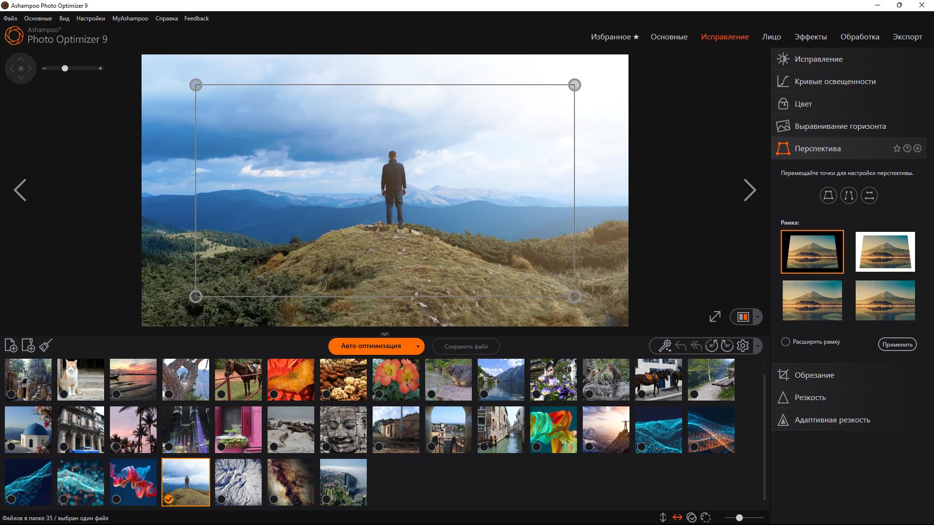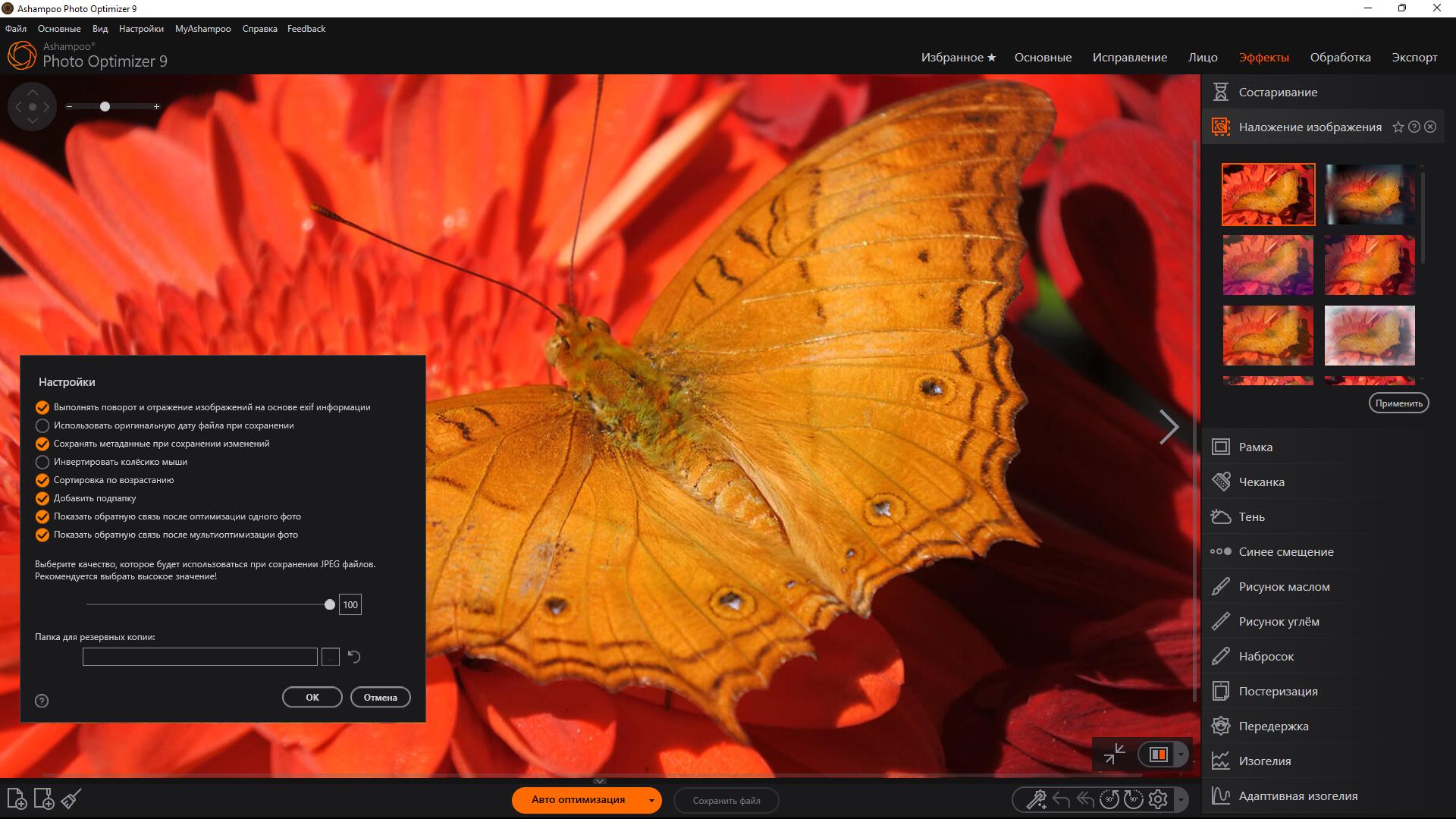 Естественно, Ashampoo Photo Optimizer 9 обладает всеми обычными функциями, такими как обрезка, вращение, добавление водяного знака и сглаживание. Но это ещё не всё. Не стесняйтесь проявлять творческий подход с помощью художественных эффектов и элегантных рамок. Не зависимо от того, восстанавливаете ли Вы неудачные снимки, повышаете качество фотографий ещё на 5% или просто развлекаетесь, эта программа для Вас!