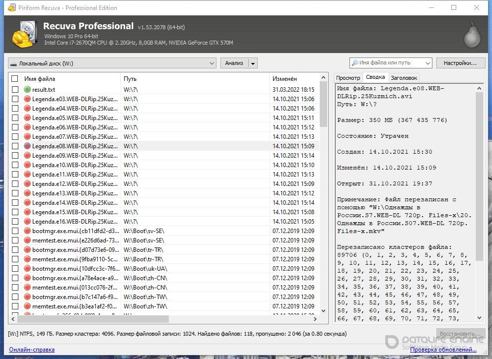 Recuva - программа для восстановления удаленных файлов. Recuva способна быстро сканировать выбранный раздел жесткого диска в поисках удаленных файлов, отображая все найденные файлы в виде списка или дерева каталогов. В режиме списка показывается состояние удаленного файла, что дает возможность оценить вероятность его полного восстановления. Данная утилита пригодится не только для восстановления утерянных файлов с жесткого диска, но и может помочь для восстановления удаленных файлов цифровых фотокамер и MP3-плееров. Присутствует возможность поиска какого-то конкретного удаленного файла по его имени.