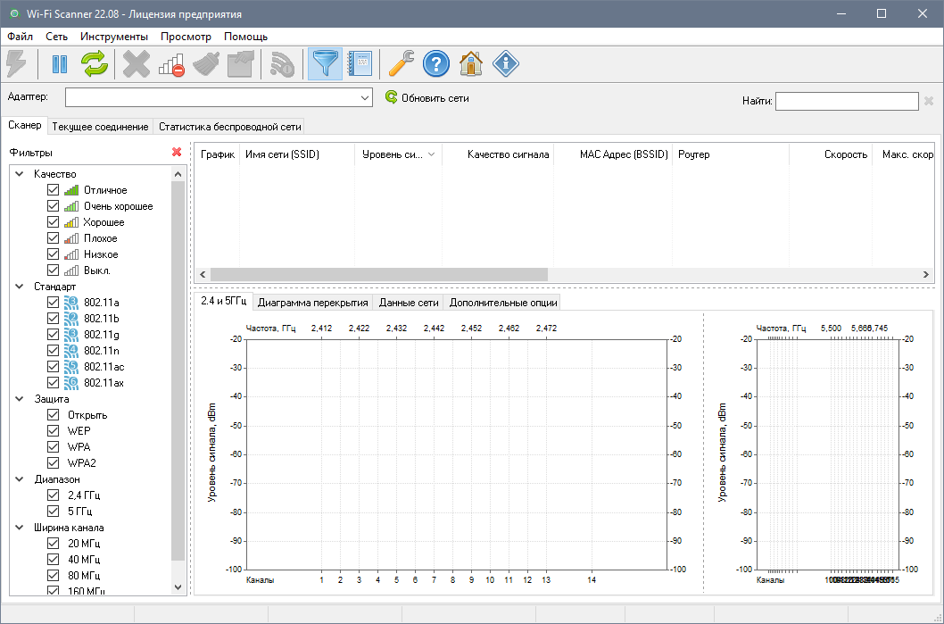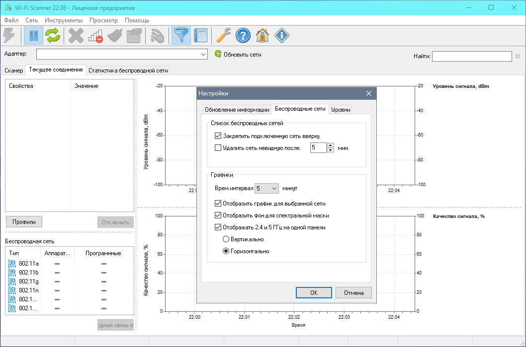- Отображение статистики беспроводного соединения в виде графиков и таблиц