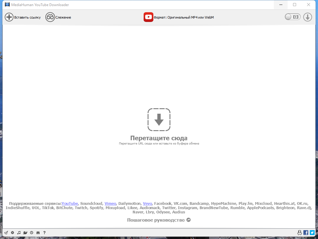 Полная поддержка функции "drag&drop". Просто перетащите ссылку на видео с помощью мыши и бросьте ее на главное окно приложения или на значок в доке (для Mac).