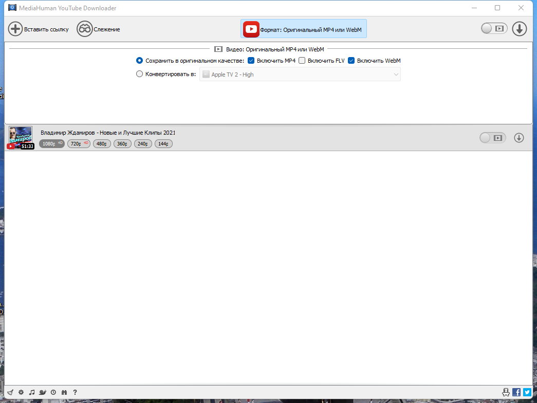 - Скачивает в оригинальном качестве и конвертирует