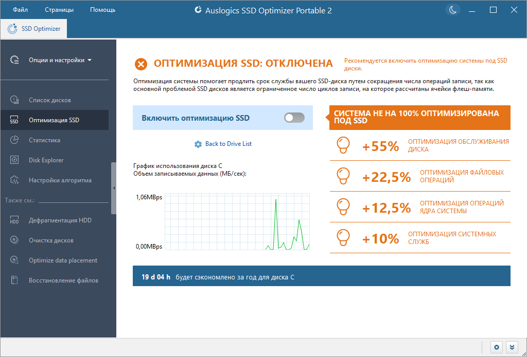 Воспользуйтесь основными опциями, позволяющими оптимизировать обслуживание дисков, файловые и системные операции, а также системные службы. Оптимизация SSD помогает сократить количество операций записи и продлить срок службы накопителя.