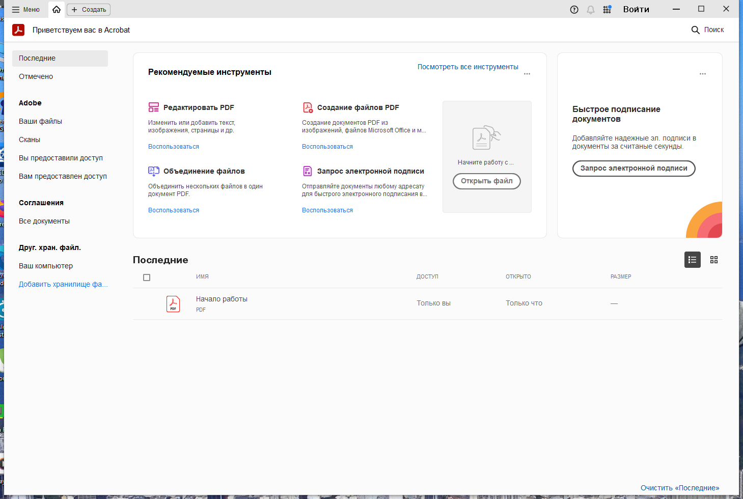 Получайте доступ к инструментам PDF и недавно открытым файлам из офиса, с домашнего компьютера или с мобильного устройства.