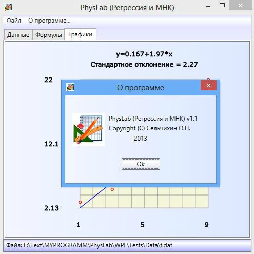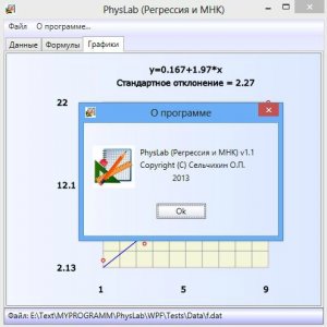 Программа PhysLab предназначена для облегчения нелегкой жизни студентов, вынужденных обрабатывать данные лабораторных работ. Выполняет регрессионый анализ (16 видов зависимости) + приближение функций методом наименьших квадратов в виде многочлена заданного порядка. Также программа может сама определять оптимальную формулу зависимости, исходя из минимума дисперсии.