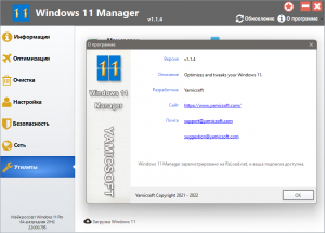 Создает запланированные задачи или мониторинг, запускающий задачи; Показывает и запускает полезный сборник утилит, встроенных в вашу Windows; Разбивает файл на несколько файлов меньшего размера или объединяет обратно с исходным файлом; Super Copy - мощный инструмент для автоматического копирования файлов или резервного копирования; Легко управляет вашим реестром с помощью инструментов реестра. [/spoiler][spoiler=Новое в версии:]Windows 11 Manager v1.1.4 released!