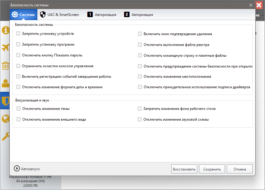Настраивает систему, компоненты, UAC, параметры входа, регулирует различные параметры и ограничивает доступ к дискам и программам для повышения безопасности системы; Обеспечьте безопасность ваших конфиденциальных файлов и папок, зашифруйте файлы, переместите системные папки в безопасные места; Privacy Protector обеспечивает конфиденциальность и защищает конфиденциальную информацию, удаляя следы; File Undelete восстанавливает удаленные или отформатированные файлы на логических дисках; Блокирует некоторые системные функции для повышения безопасности.