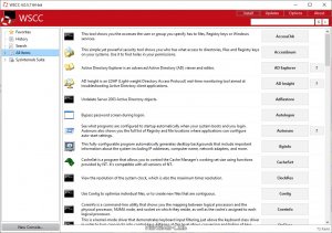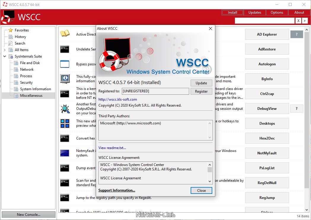 WSCC (Windows System Control Center) - портативная программа, представляющая из себя оболочку, которая объединяет в себе пакеты Sysinternals Suite и NirLauncher. Все утилиты входящие в данный набор, разделены по категориям в зависимости от назначения, а также присутствует возможность запуска некоторых встроенных средств Windows.