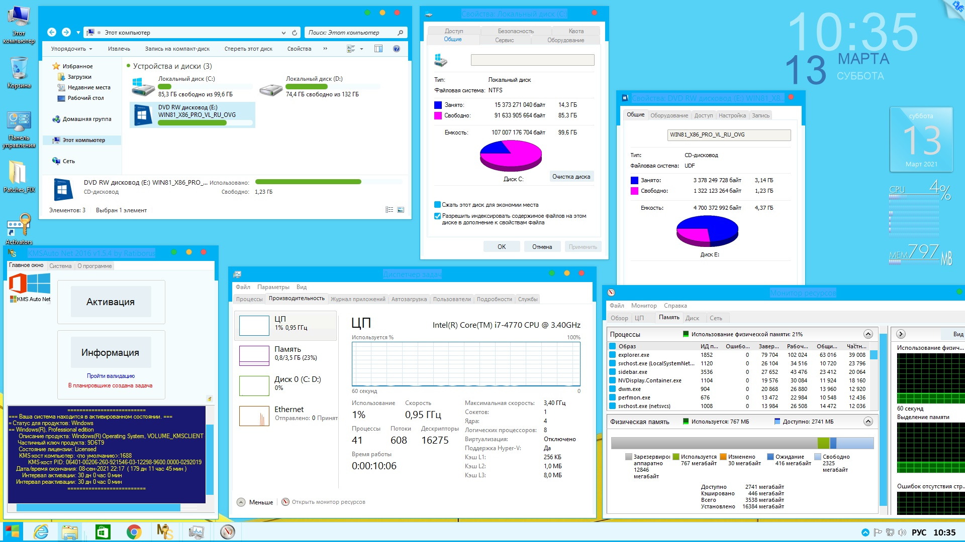 10. Общие впечатления от системы в основном положительные, если её немного настроить под "себя". По субъективным впечатлениям, Win8.1 самая быстрая и лёгкая, по сравнением с другими. Никаких проблем не наблюдается ни от установленного ClassicShell, ни от пропатчивания системы UXPatcher, ни от установленных тем и гаджетов.