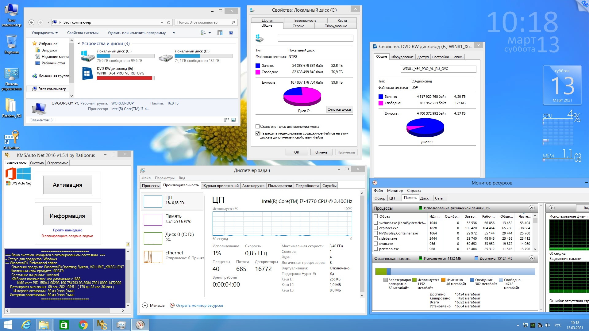 ◄ Примечание: ► активация системы возможна KMS активаторами на 180 дней с последующей переактивацией в ручном или автоматическом режиме. Дополнительно: активатор можно настроить на автоматическую периодическую активацию системы чтобы не беспокоиться в дальнейшем. Иногда, после установки драйверов или каких либо программ активация может слететь, проверьте и при необходимости произведите процедуру по новой.