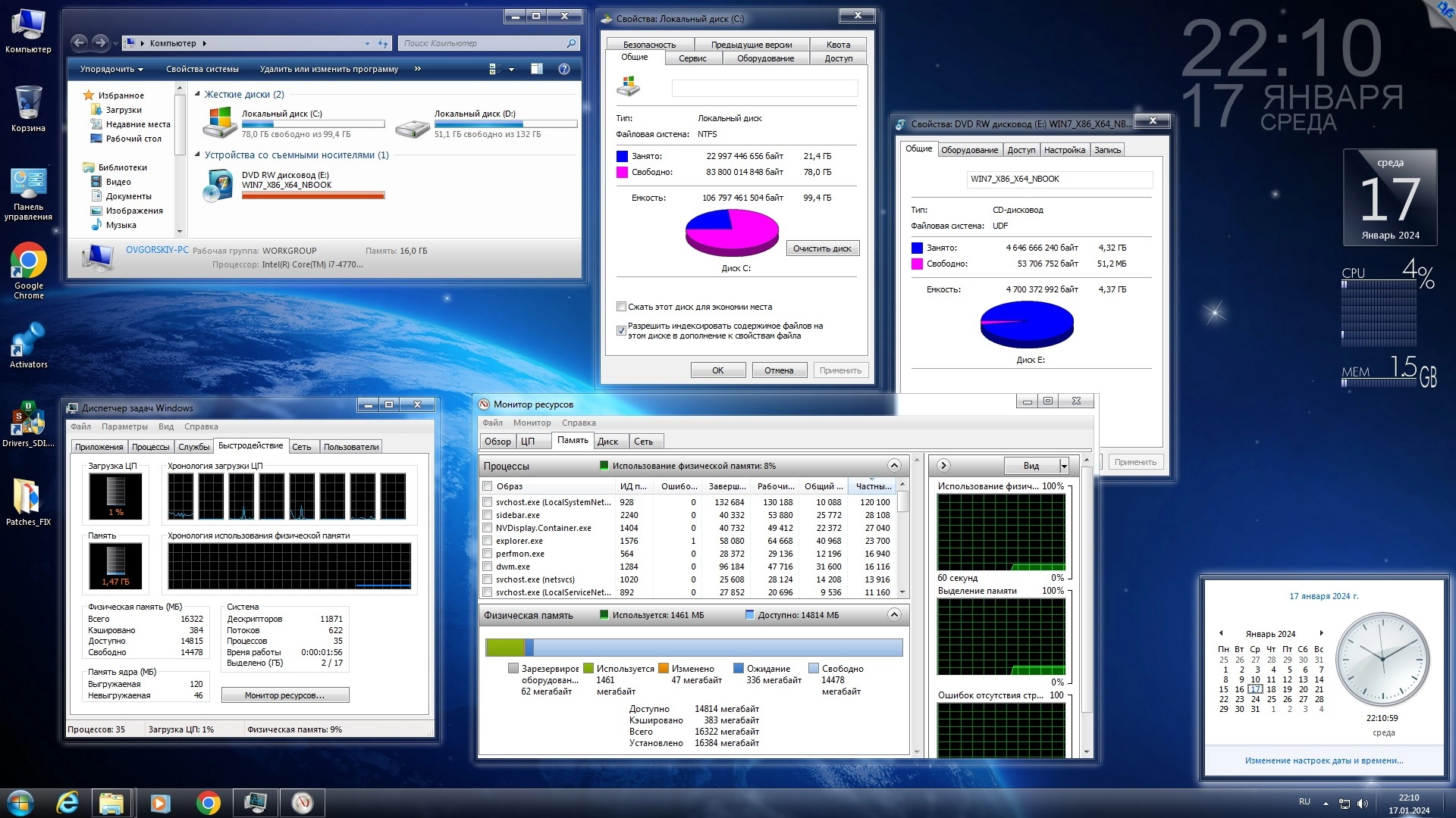 - Отключены UAC, гибернация, автоматическое обновление. Оптимизирован файл подкачки до 2-4 ГБ (см. примечания).