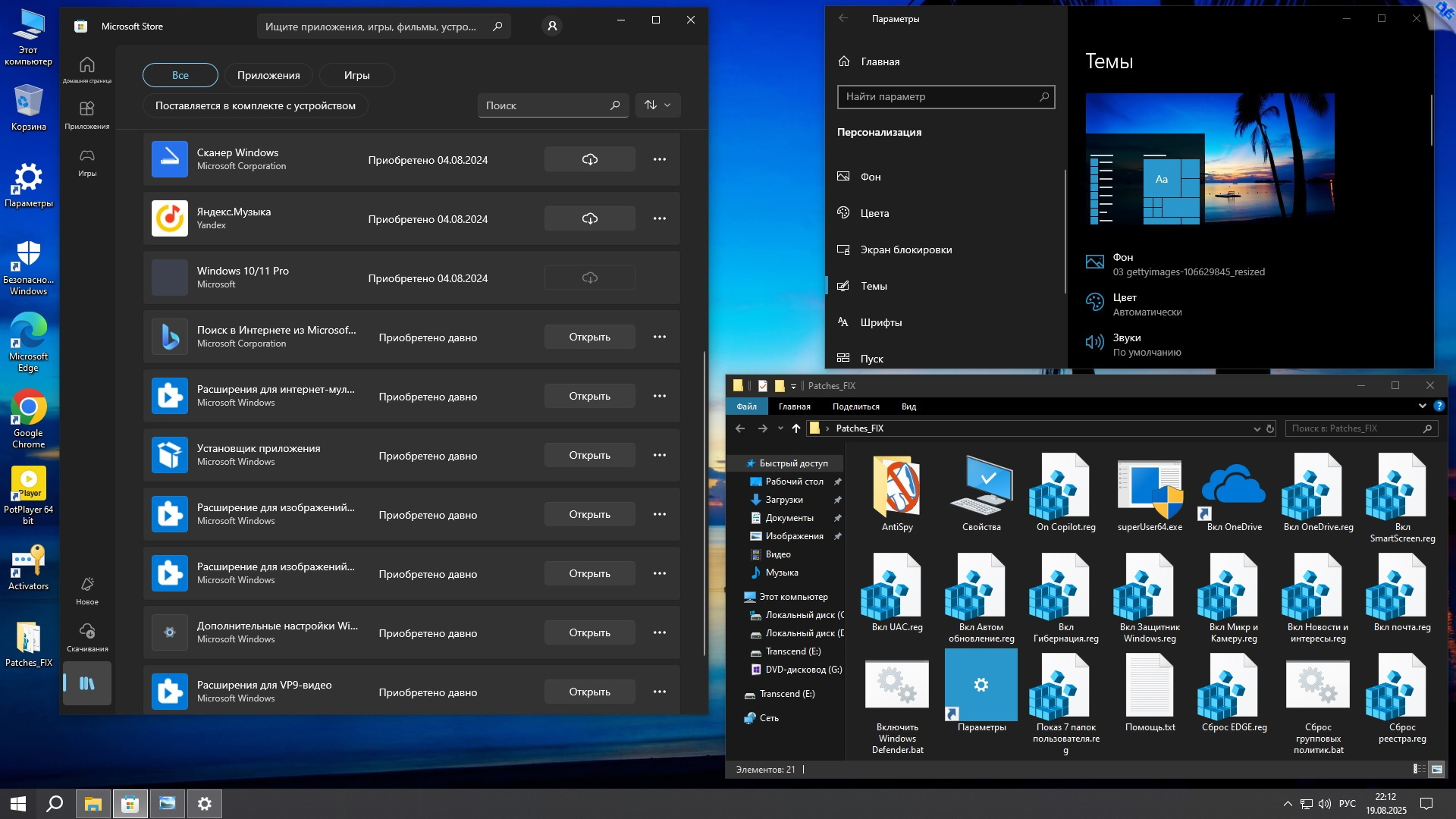 - На рабочий стол добавлена папка Patches_FIX с патчами системы, твики для включения защитника Windows, SmartScreen, UAC, гибернации, телеметрии, "Новости и Интересы", микрофон и камера, автоматического обновления, показ 7 пользовательских папок в окне Компьютер, OneDrive и др. В папке "AntiSpy" находится антишпионская программа ShutUp10.
