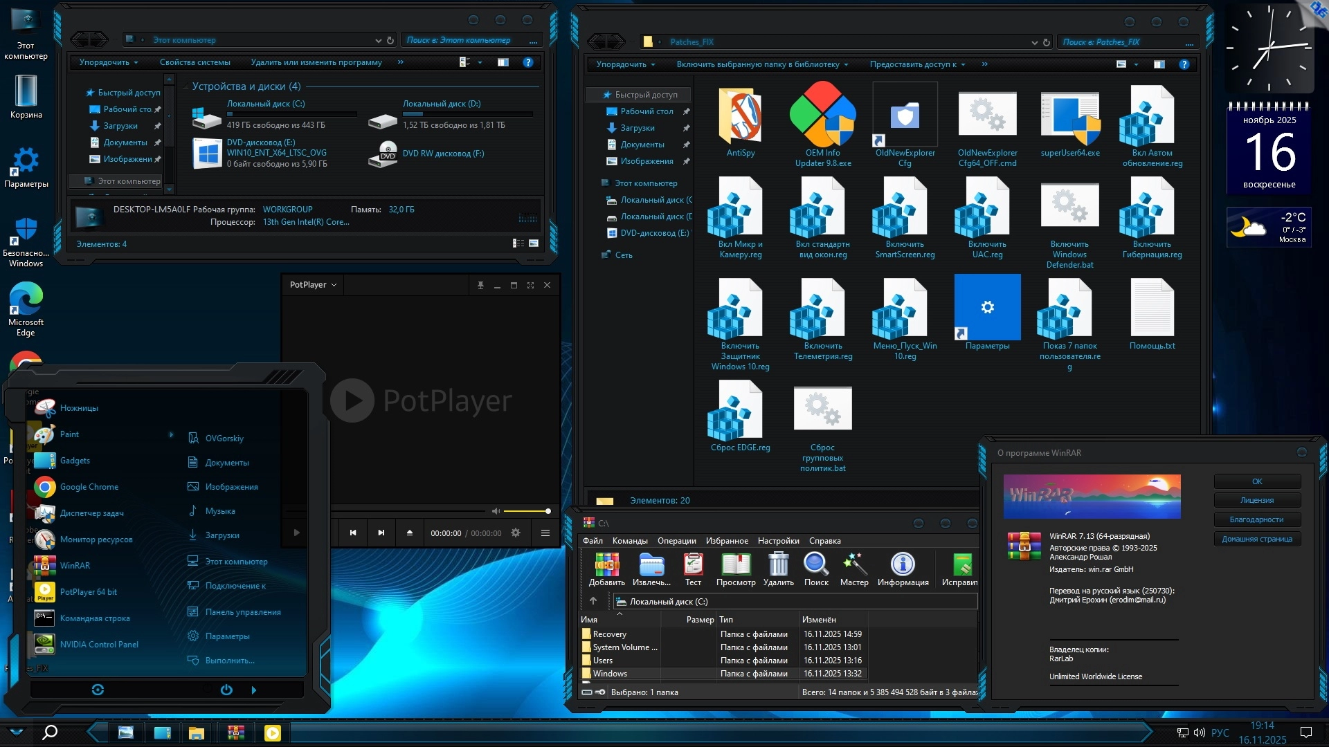 • Отключены: Контроль учётных записей (UAC), защитник Windows, автоматическое обновление, SmartScreen и панель "Люди", несанкционированный доступ к микрофону и камере.