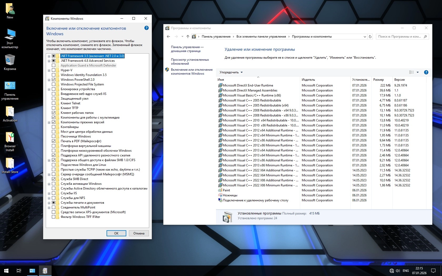 • В Компонентах Windows дополнительно включены Framework 3.5 и некоторые другие компоненты. Их состав легко поменять по своему усмотрению.