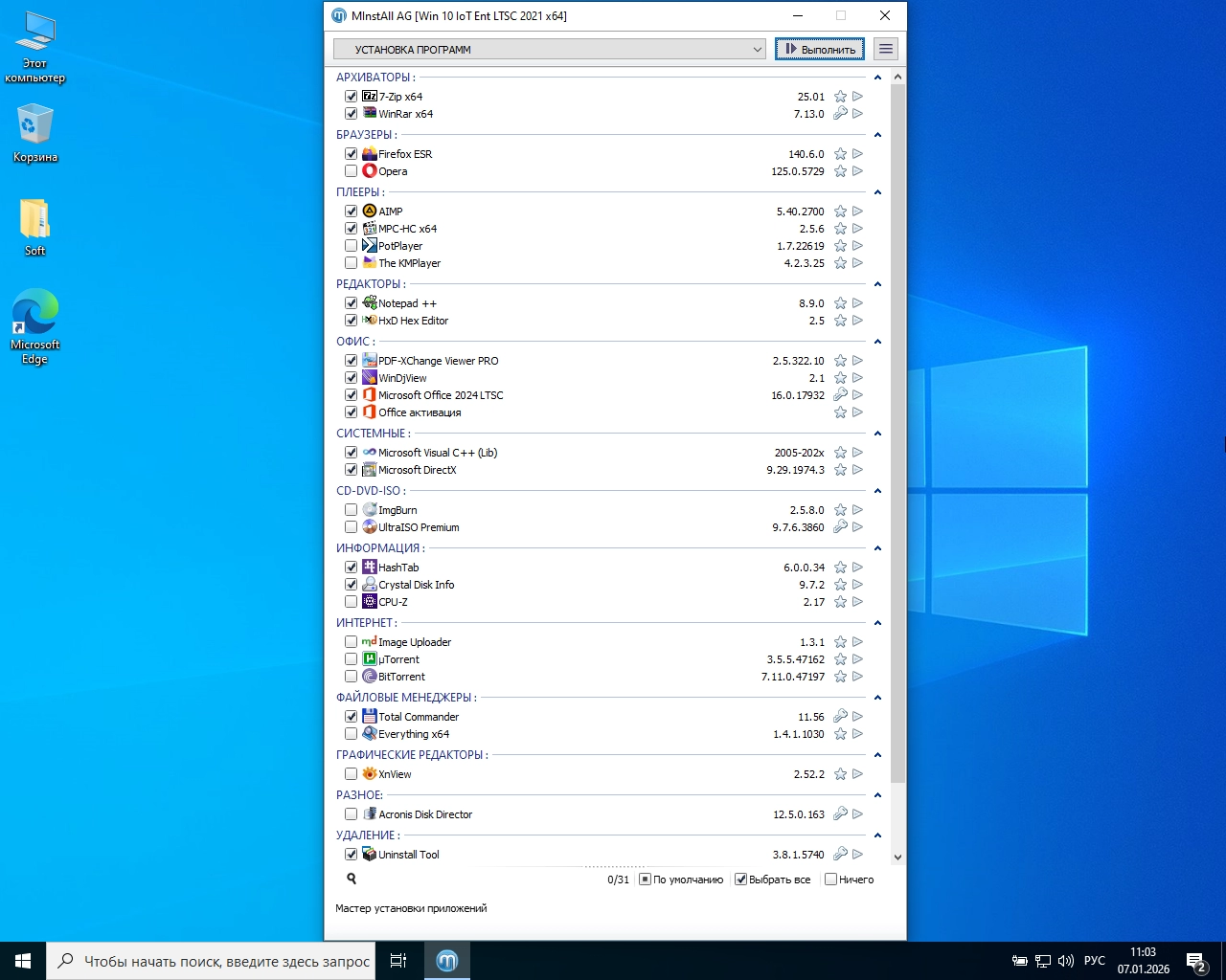 • Есть возможность выбора софта, что нужно ставить а что нет. Разрядность ОС и софта определяются автоматически.