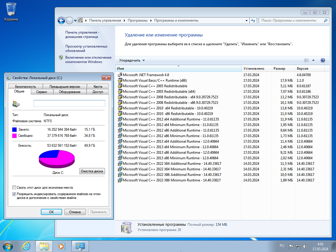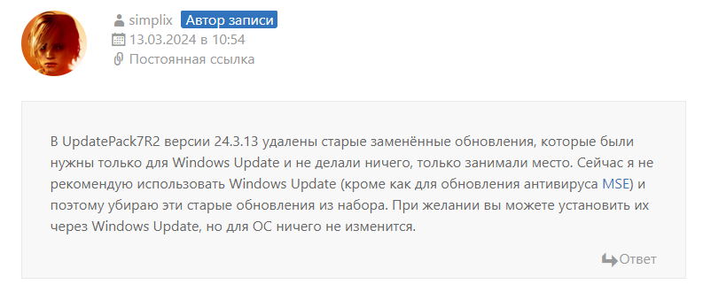 Интегрированы обновления по 13.03.2024г. с помощью UpdatePack7R2 от Simplix, версия 24.3.13. Присутствует поддержка NVMe и USB3. Присутствует поддержка установки в режиме Legacy и UEFI. В сборке применяется более современный и быстрый установщик от Windows 10 x64 (22H2), который поддерживает сжатие и полностью поддерживает установку Windows 7 и позволяет исправить недостатки старого установщика от Windows 7, как отсутствие необходимых драйверов на AHCI, USB3, NVMe и пр. Никаких последствий на установленную систему замена установщика не имеет, так как установщик работает только непосредственно во время установки системы. На время установки сжатие не оказывает почти никакого влияния. Метод установки операционной системы идентичен оригинальной. Сборка в режиме аудита не была. Примечание!!! Подобного рода сборок от данного автора в исполнении x86 не будет.