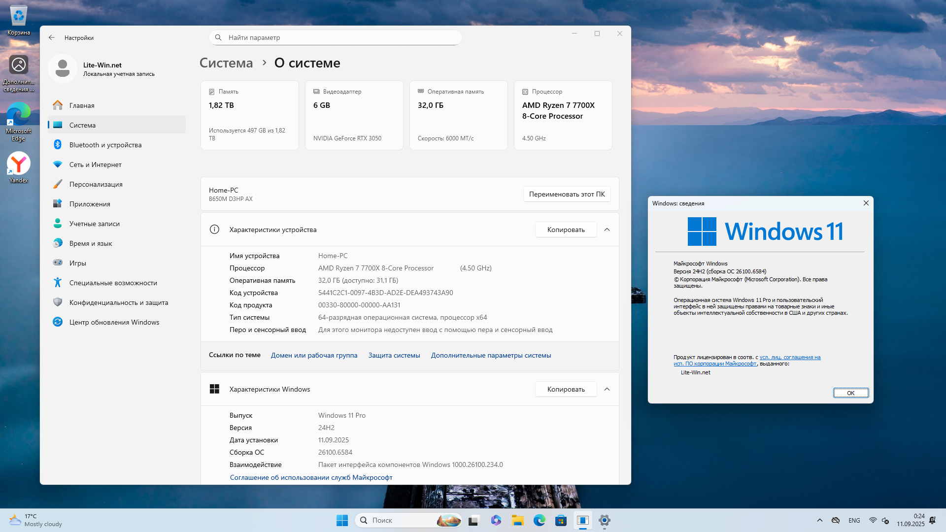Технические данные Windows 11 Pro 24H2 Build 26100.6584 Full Сентябрь 2025 торрент: