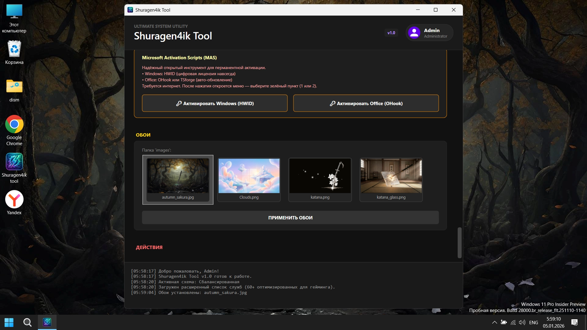 • Активация Windows (HWID) и Office (OHook) через MAS.