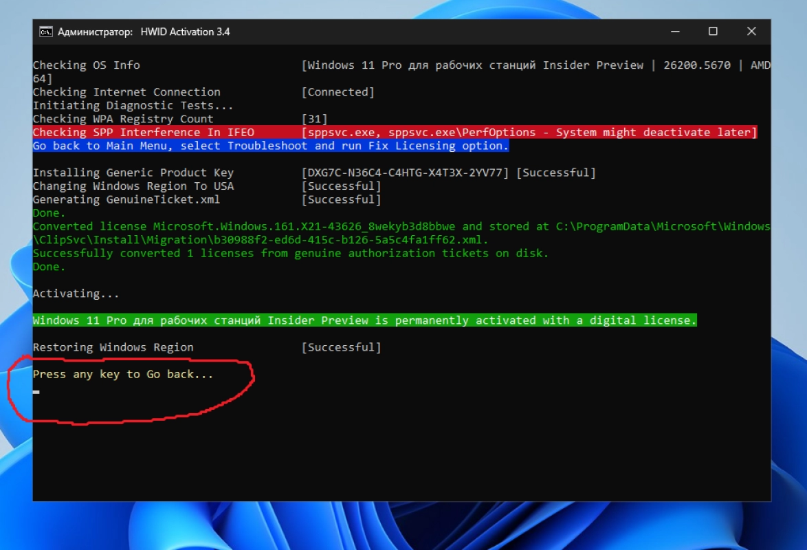 • В случае активации windows, дождитесь появления желтой строчки, которая означает успешную активацию